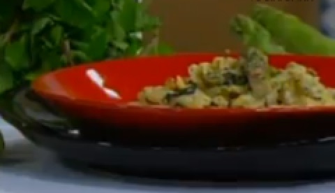 Misture bem, acrescente a rúcula e transfira para o prato.