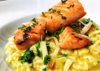 2- Esse risoto fica ótimo, por exemplo, com postas de salmão grelhado, como na foto.