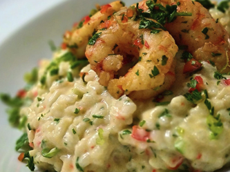 Na hora de servir, coloque no prato uma porção do risoto e finalize com uns 3 camarões inteiros.