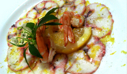 - Disponha em um prato raso fatias bem finas do carpaccio de polvo. No centro, coloque alguns camarões e decore com fatias de limão siciliano, regando com o molho.