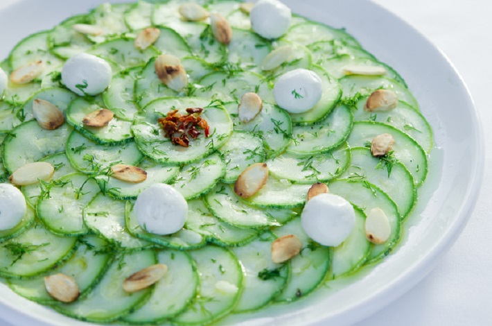 - Polvilhe o prato com lâminas de amêndoas tostadinhas e decore com bolinhas de muçarela de búfala ou cubinhos de queijo branco.