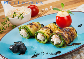 - Coloque uma colher (chá) desse recheio na ponta de cada lâmina de abobrinha e enrole-a suavemente.