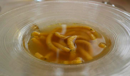 - Usando um passador, corte fios de massa com cerca de 7 centímetros sobre o caldo de carne, que deverá estar muito quente.