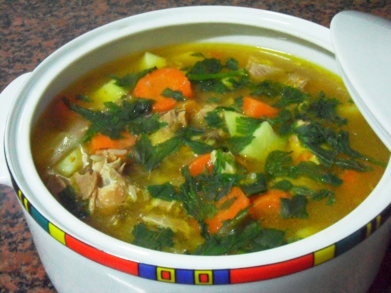 - Cozinhe tudo por 1 hora, retire os peitos de frango, coe o caldo e reserve (elimine todos os outros ingredientes cozidos e coados).