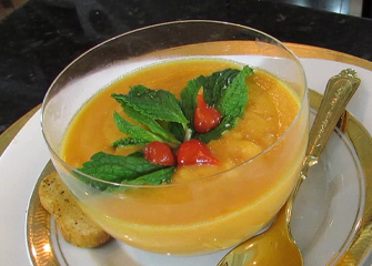 Em um bowl, coloque com uma concha o consomê e, para enfeitar, uma folhinha de hortelã, que ajuda a deixar o sabor mais fantástico ainda.