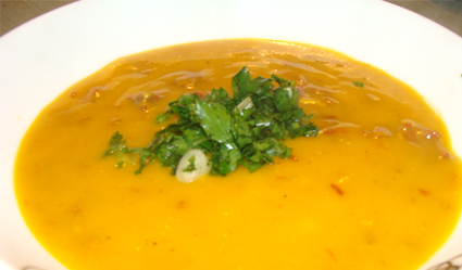 - Junte a abóbora, tempere com sal e pimenta, misture e adicione o caldo. Reduza o fogo, deixe a panela semitampada e cozinhe por uns 10 minutos ou até que a abóbora fique bem macia.