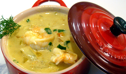 - Adicione o curry, refogue mais um pouco e junte os camarões.